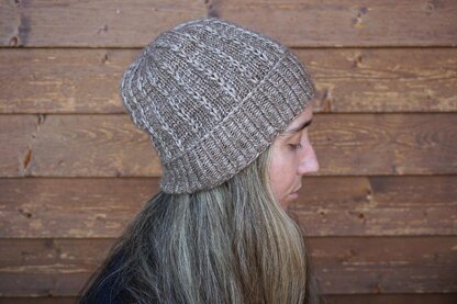 The hat is worked in the round from the bottom up and is started with a half twisted stitch ribbing. The ribbing is separated with a gorgeous vikkel braid. All over the body and crown of the hat growing lines of slipped stitches are placed on a background of easy stockinette. The hat can be worn fitted (black sample) or more slouchy (brown sample). It uses only one skein (50g) of Illimani Amelie yarn.