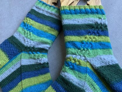Tower Stairs is another of the traveling socks, mostly vanilla with a spiraling cable pattern added for fun. The cable pattern winds around the leg before gradually decreasing off the side of the foot.