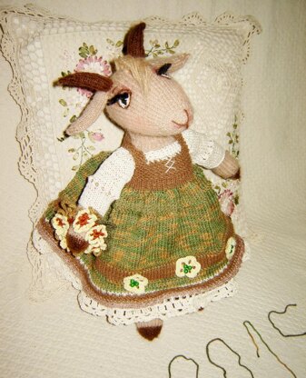 Goat plush in folk style. This Knitting Pattern is clear, easy to read, in English. Their assembly is shown in step-by-step 37 photographs. The pattern for knitting a goat toy includes a description of knitting and assembling the goat, its dress, and accessories. This is a wreath and flowers to decorate the dress. If you follow these instructions for making a stuffed goat, the finished toy will measure about 13 inches.