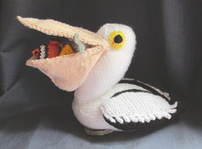 A toy pelican with a beak full of fish! His beak shuts to store his fish safely.