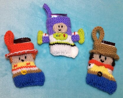 This knitting pattern is for three christmas stocking tree decorations as Woody, Buzz and Jessie from Toy Story inspired characters.