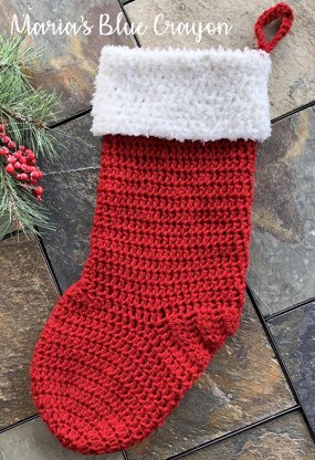 This basic stocking is a classic to make for yourself and your family. Made with red worsted weight yarn and a fuzzy trim cuff, this Christmas stocking is super easy and quick to make.