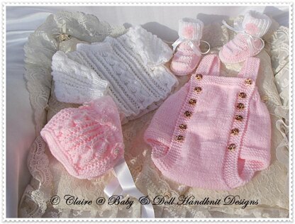 Knitting pattern for a traditional style buttoned romper, lacy jumper, bonnet and cute little boots.