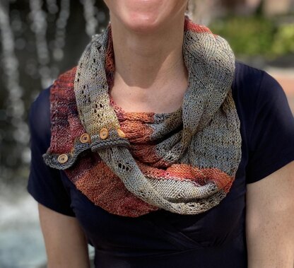 I’m not getting to do any traveling this summer, so I threw my fantasies of feeling sophisticated and cultured as I wander through bustling cities into a scarf design. Like any experienced traveler this scarf is flexible, with a row of buttons that allow it to transform from a regular scarf into an infinity scarf. It is also light and soft, so it is a perfect layering piece for slipping into an air-conditioned movie theater to take in a French film, or spending a relaxing evening walking by the ocean. The varied colors of the beautiful Medina from Berroco ensure that it will complement all of your easy-pack clothes.