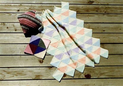 Knit up these fun and easy square / triangles, for a cute baby blanket, shawl, pillow, afghan, coffee mat, and more! You will think of even more ways to use these, with all your scrap yarns! We call these traveling as they make good travel projects. Or, knit one or two on your lunch hour! In no time, you will have enough for many projects. We uses sport weight yarn, and knitting needles US # 9.