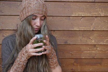 The Tree Bark Set contains a hat and mittens The hat is worked in the round from bottom up and started with 2/2 ribbing. The ribbing grows into tree trunk cables and ends again in ribbing, where the decrease for the crown begins. The mittens are worked the same at the beginning and end with 2/2 ribbing. They are straight and without a thumb hole.