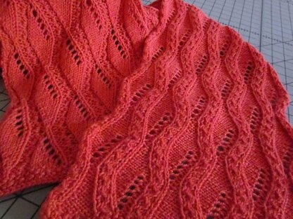 Finished size: Worsted Scarf: 6” x 65” unblocked, 10” x 76” blocked Worsted Wrap 10” x 65” unblocked, 21” x 76” blocked