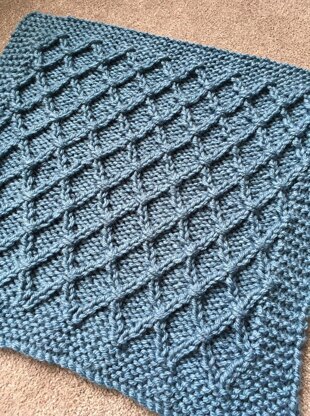 This deeply textured blanket uses simple 2-stitch cables and wrapped stitches to create a trellis pattern. Its knitted all in one, so there's no sewing involved. Instructions are given for three sizes and the unisex design makes it a good baby shower gift. I used an easy care, acrylic yarn. If you use a different yarn, be sure to check the yardage, and choose a yarn that isn’t too fluffy.