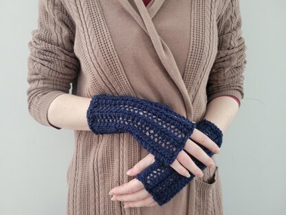 Fingerless gloves with a sleek trellis lace design for a slimming, finger-enhancing look. The dark colored yarn accentuates the open lacework, but a soft color will have a feminine grace.