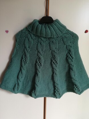 Knitted poncho/cape with 6 stitches left cables and a little lace motive. Size: S/M (L/XL), length ~58cm, instructions for bigger sizes