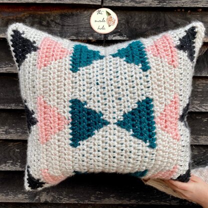 A trendy throw pillow to add a geometric accent to any room in your house, perfect for a nursery, bedroom or living room. A great beginner project if you are new to crochet colorwork, using only half double crochet stitches. The cushion cover is stitched in rows and consists of 2 panels. When complete, the panels are sewn together to form the pillow case.