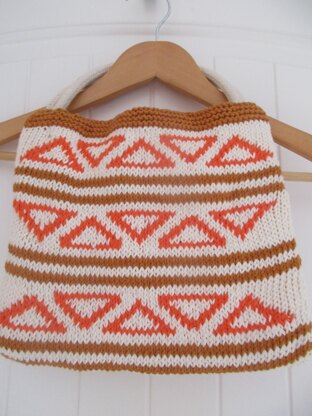 This is a pattern for a Triangles Beach Bag, originally published in Simply Knitting issue 173. It has intarsia triangles and stripes, lining and wadding and rope handles.