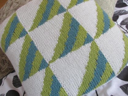 This is a pattern for a Triangles Cushion Cover, originally published in Simply Knitting. It has an intarsia front, a plain back and is finished with a moss stitch contrasting button/ buttonhole band.