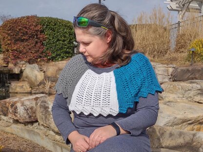 Description: The Tricolored Capelet is a light and airy accessory that is great for spring or summertime. The capelet works sideways and uses very soft, ribbon-like cotton yarn, that drapes easily. Three colors are used and they repeat in front and back.