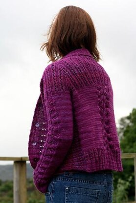 If the standard construction of sweaters has left you bored, here is a cardigan with a difference! The back and sleeves are knit first, then the front and yoke are picked up and knit as one piece. This creates a cozy cardigan with a horizontal lace rib that flows seamlessly and leaves you with very little finishing work. Sleek raglan decreases form eye-catching shoulder details and a luxurious shawl collar gives it the perfect finish.