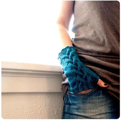 Trilsea’n - (tril-shawn) : Gaelic for “braid", these fingerless gauntlets display an offset two-strand Celtic braid up the length of the glove and a ribbed cuff.