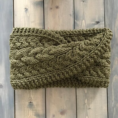 This bulky weight, mobius cowl uses a blend of two sizes of braided cables to create a design that flows around the entire piece. This cowl is knit in the round so that after the bind off, it will have a double layer when it is laid flat. The cable set is worked twice, (on the front and the back), so that when the twist is put in place, the cable design will always be facing outward.