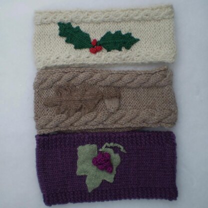 These headbands use a standard size for adults but can be made larger or smaller as needed. Instructions for altering size are included in pattern. Feel free to place the holly leaves and berries on the headband made for oak, or the oak leaf and acorn on the headband made for grape. It’s okay to mix and match! (But do keep the colors in order.) The grape headband uses simple knit and purl stitches, the holly headband uses a mock cable stitch so that it looks like you cabled but really didn’t (shhh! I won’t tell), and the oak headband uses a very simple cable that’s great for those who want to learn how to cable. It looks fancy but is quite easy to do. The headbands all work up quickly and the decorative extras don’t take too long, either.