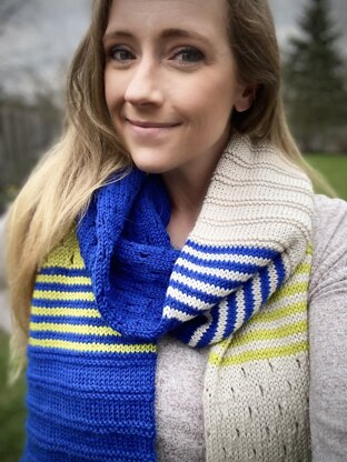 This tri-colored, color block scarf uses four different design elements to create a fun and unique color mashup. The rich texture is achieved by using a combination of garter stitches, stockinette, and eyelet lace.