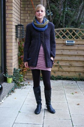 Die Anleitung gibt es jetzt in 4 Größen von 34/36 -46/48. Das gezeigte Modell ist in Gr.38/40 Es werden zwischen 14 und 17 Knäuel in Grau benötigt. Für den doppelten Loop braucht man zusätzlich je 2 Knäuel in Jeans und Oliv. Die 4 Knöpfe sind von Jim Knopf. Die Nadeln 1/2 bis 1 Nadelstärke kleiner wählen, da die Jacke aus einem Dochtgarn gearbeitet ist.
