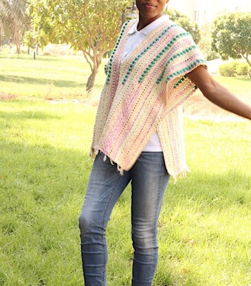 The Tropic Poncho crochet pattern is made from two rectangle parts seamed in the middle, sides and front. It makes for easy wear and a chic layering garment through most seasons of theyear. It is made with a blend of cotton/acrylic sport weight yarn and is a one size fits most. It is pretty easy to customise for larger/warmer sizes; just switch to heavier yarn weight and so 100% acrylic yarn.