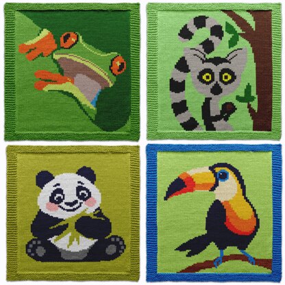 Bring the wild beauty of the rainforest to your needles with this vibrant set of four tropical animal blocks! Featuring the wide-eyed Red-Eyed Tree Frog, the curious Lemur, the bold and colorful Toucan, and the cuddly Bamboo-loving Panda, each square captures the playful spirit of these iconic jungle creatures in a charming, nature-inspired design. Each block is worked flat with a garter stitch border framing the smooth stockinette center, making them perfect for kids blankets, nursery pillows, fun tote bags, whimsical wall hangings, or as adorable accents on sweaters and cardigans. Combine all the squares together to create a charming baby blanket or decorate a child’s bedroom with beautiful themed pillows — the possibilities are endless! Finished size depends on yarn: Sport (5 ply, 3.5 mm): ~37×37 cm (15″×15″) ~120 g. DK/worsted (3.75–4 mm): ~46×46 cm (18″×18″) ~140–180 g. Aran (5.5 mm): ~52×52 cm (20″×20″) ~250 g. Gauge: Sport 22×32 sts, DK/worsted 18×26, Aran 16×23 per 10 cm