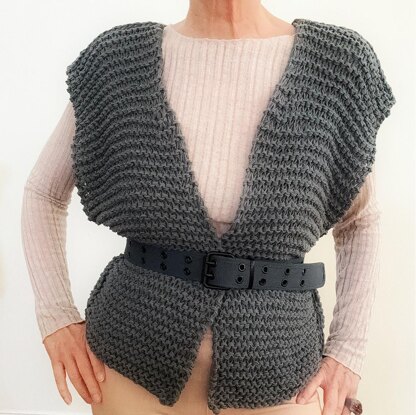 One size vest, the measurements are 20“ in length, 44” in width with a 4” front opening, a 7” shoulder seam, the single bottom front side measures 9.5” with an armhole measuring 21” in circumference. The pattern is entirely written.