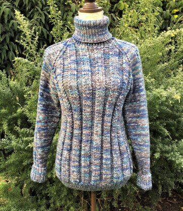 A cosy, textured rib sweater with comfortable raglan sleeves. The wide rib is edged by an easy 2 stitch twist, adding extra surface interest. Sleeves have a vertical panel of twisted rib. Worked bottom up and with full written instructions.