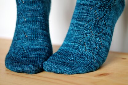 Tuil-Bheum, the rushing torrent of water caused by a sudden burst of rain, is captured in the flowing cascading lace down the side of these socks. Knit from the toe up with a gusset and heel flap, these socks are the perfect mix of relaxing knit and engaging pattern with a simple easy to learn lace pattern. With three widths and flexible length fitting, these are a great pattern for everyone.