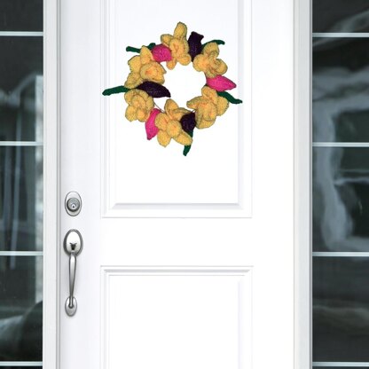 The pattern shows row by row instructions and colour photos to knit daffodils, leaves and tulips to create a spring flower wreath as illustrated on the images.