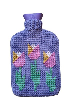 Hot water bottle cover, made in Tunisian simple stitch, with a cross stitch tulip detail on the front.