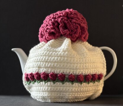 The 15 page pattern is presented in a step by step guide with illustrative photographs. The design is a vintage crochet style with its line of Tulips and for full impact finished with three colourful floral pom poms. The main yarn used in the design for the cosy is a Hayfield Chunky yarn in Cream 100g. It creates a thick thermal cosy, it can be made with a DK yarn but the finish will not be as firm. The Tulip / floral pom poms use 70g in Hayfield Bonus DK in Cerise. The leaves in Grass I used less than 5g. The pom pom design can also be crafted into a delightful keychain and is explained in the pattern.