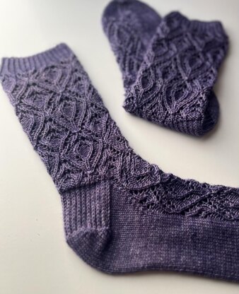 This intricate-looking, lace sock pattern reminds me of tulips (hence the name). Worked from the top-down, the pattern is easier to knit than it appears and really shows off best in more subtle yarns like solid, semi-solid or slow gradient colorways. The pattern includes written and charted instructions for two sizes.