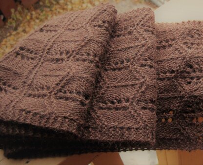 In order to achieve symmetry in the lace patterns, this scarf is worked in two pieces from the ends toward the centre. The two pieces are then grafted together using kitchener stitch.