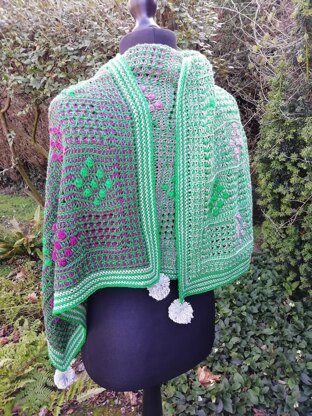 Explore some simple stitches to create a beautiful, functional wrap. Worked in Tunisian crochet, the wrap has both weight and texture. I wanted to design something that was relatively straight forward, so that I could enjoy the rhythm of the stitches without constantly referring to the pattern, but that included an interesting range of Tunisian stitches. The wrap is based on a grid pattern, worked in one piece. The squares in the pattern are made using Arrowhead stitch and Bobbles on a Tunisian Simple stitch ground. The Honeycomb stitch border allows the wrap to drape without curling at the edges. For added interest, I used a Scheepjes Whirl in Slice O’ Cherry Pie with contrast Whirlettes in Kiwi. The colour is changed after each forward pass, so the yarn is not cut, meaning very few ends to sew in. The size can be easily changed - make more repeats, or add additional rows of honeycomb at the top/bottom edges (but you would need more yarn).