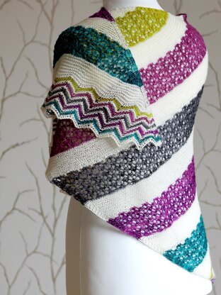 Turadh is Gaelic for ‘a break in the weather’ and that is exactly what the stripes in this shawl remind me of - a shining flash of colour through the clouds! Worked from one corner, this assymetric shawl is great for showing off mini skeins or left overs in a truly stunning way. The lace stripes feature a zigzag chevron pattern, which is echoed in the chevron striped border. Turadh is a great fun knit with plenty of relaxing bits!