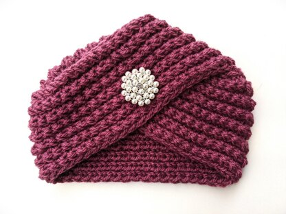 Knit turban is a stylish accessory for cooler weather. This turban worked flat. The finished hat has plenty of stretch to fit most sizes.