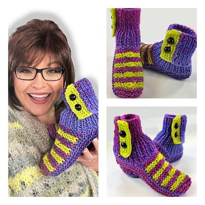 These fun slippers are made flat then turned into a three-dimensional object with some nifty shaping on the sole.