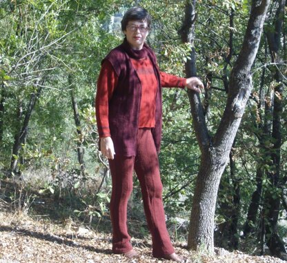 Columns in alternately plain st and moss st in col. A where col. B makes checks on the shoulders of the guernsey. The collar is made in col. C which also is the colour of the cadigan. The sleeves of the guernsey are worked from shoulder and downwards. The trousers (in col. B) are shaped properly after tailoring principles giving the model a splendid fit. To work flat - detailed written pattern with charts.