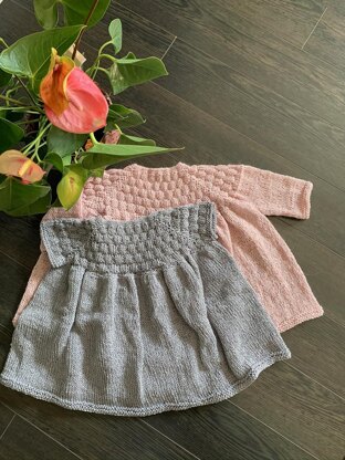 Klänningen är stickad uppifrån och ned med virkade knapphål i ryggen.