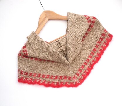 Brighten up this otherwise plain tweedy shawl / cowl with stripes of mosaic knitting in a bright colourful red delicate mohair yarn. The mohair has also been used as a fluffy edge to the shawl. If you want to try your hand at mosaic knitting with a simple chart and full written instructions then this is the pattern for you.