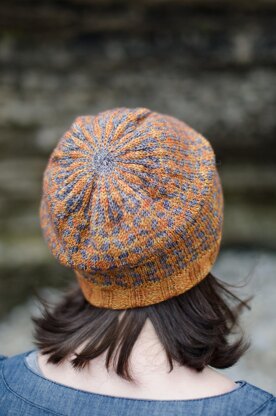 Twegen is a hat and fingerless mitten set. Its doughnut segments flow in and out of one another, creating a continuous web on the stocking stitch ground. The hat’s crown flows effortlessly from the main stitch pattern below, bringing the contrast colour to converge at a point.