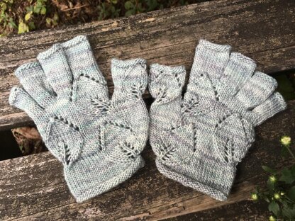 Twin Leaf Gloves are perfect for that slightly nippy Fall or Early Spring day when you just can't quite keep your hands warm without a little help! Dainty and elegant while keeping you cozy with that extra boost of warmth, Twin Leaf Gloves can be worn indoors or out. Knit in the round on double-pointed needles, they are an engaging but quick knit with just enough lacework to keep you focused. And since they require less than one skein of yarn per pair, they are perfect for stash-busting! Designed to fit closely with 0.5" to 1" negative ease, Twin Leaf Gloves are sized for women's hands in small, medium, and large. To determine the appropriate size, measure around the knuckles of the dominant hand and choose a size with a hand circumference 0.5" to 1" smaller than your measurement. Pattern instructions are both written and charted.