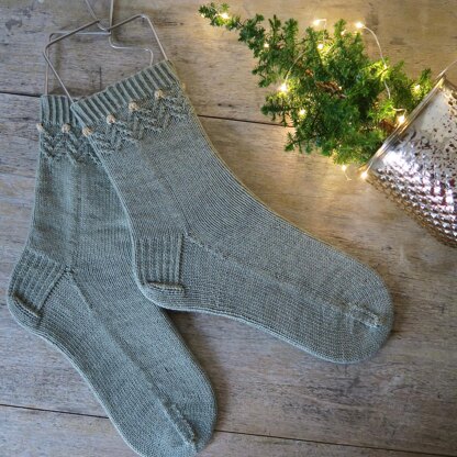 The Twinkling Trees socks begin at the cuff with a neat and tidy twisted rib and then come the twinkles. Contrasting bobbles top a row of simple cable trees around the leg. We then move into simple stocking stitch and a slip stitch heel. This top down sock is finished with a rounded wedge toe - the perfect finish for these elegant socks.