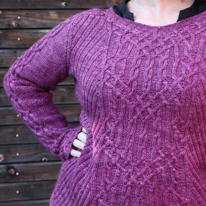 You could say this is the platonic ideal of a weekend pullover: relaxed, cozy and classic – but never boring! Sinuous cables are flanked by angled rib panels that move with the body, creating a flattering fit without waist shaping.