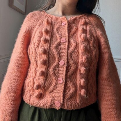 This cropped and fitted cardigan features a beautiful cable knit pattern that adds depth and texture. The top-down construction makes it a quick and rewarding project for knitters of all levels. You will also find some bobble stitch