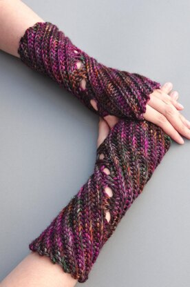These nifty fingerless mittens are crocheted entirely in slip stitches. The decorative lace doubles as a row of thumb holes. It is symmetrical in the left and right mitten.