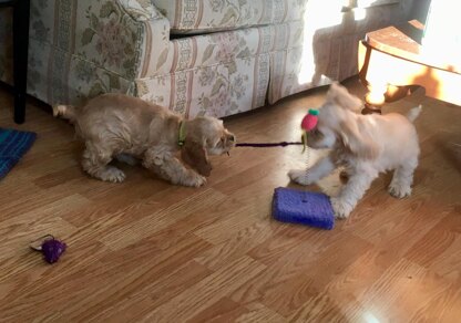 We adopted 2 puppies, 7-week-old cocker spaniels, and since we’d only equipted ourselves for one (the second was a surprise we couldn’t resist!), it seemed that I was in a rush to make lots more toys small enough and soft enough for little puppy teeth!  The toys are made with baby-safe yarns and can be washed after drooling... grin