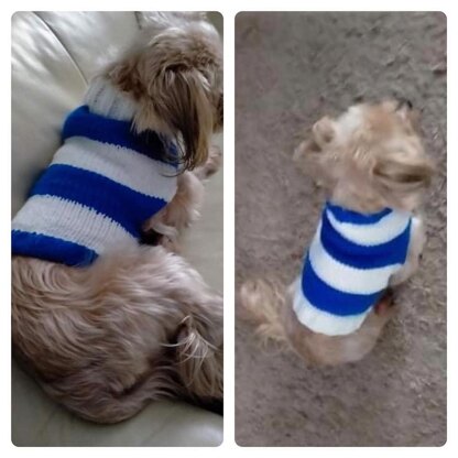 With this cosy striped sweater, your dog feels warm but looks cool, and if you knit it in your favourite football team colours, you can watch the match together in style!