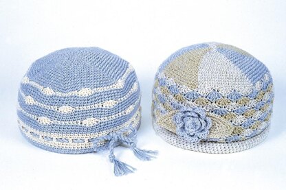 Both hats have an easy scallop design. The pattern has an illustrated stitch guide for single crochet, double crochet and changing yarn color, as well as written directions and a diagram to show how to make the cord for the hat with a bow. American crochet terminology.